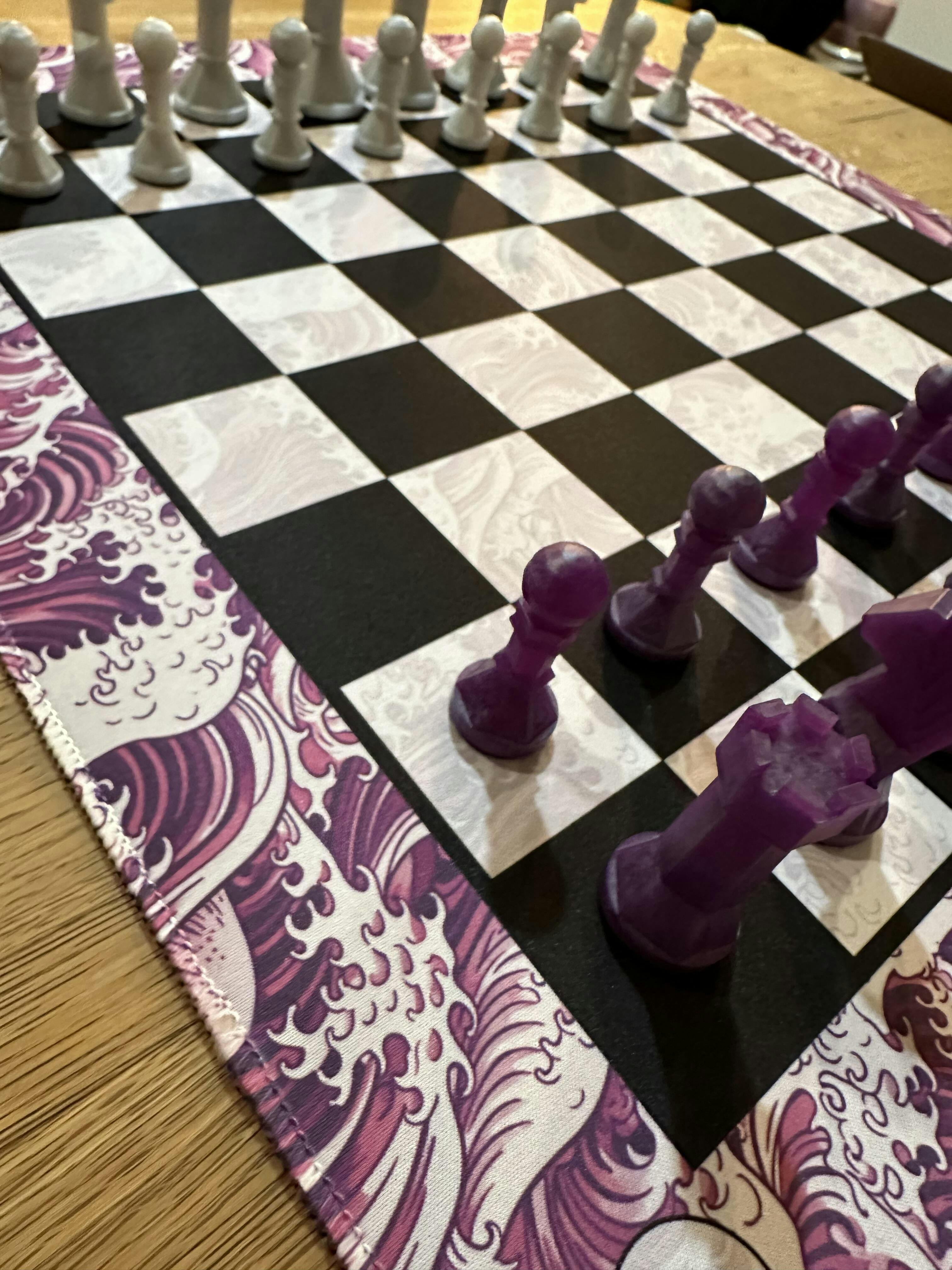 Got my set a few days ago. I was wanting a standard sized set and this checks all the boxes. The print quality on the board is fantastic, it’s grippy and sturdy but isn’t super heavy when rolled up like many rollable boards are. The pieces have a nice felt material on the bottom, have no sharp edges, and are great to play with!